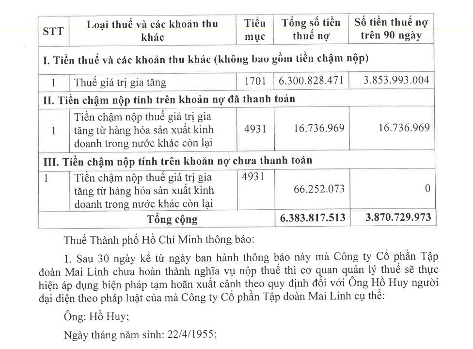 Sau 30 ngày kể từ ngày ban hành thông báo, nếu CTCP Tập đoàn Mai Linh chưa hoàn thành đầy đủ nghĩa vụ nộp thuế, cơ quan quản lý thuế sẽ thực hiện biện pháp tạm hoãn xuất cảnh đối với ông Hồ Huy, người đại diện theo pháp luật của doanh nghiệp. Ông Hồ Huy hiện cũng là Chủ tịch Tập đoàn Mai Linh.