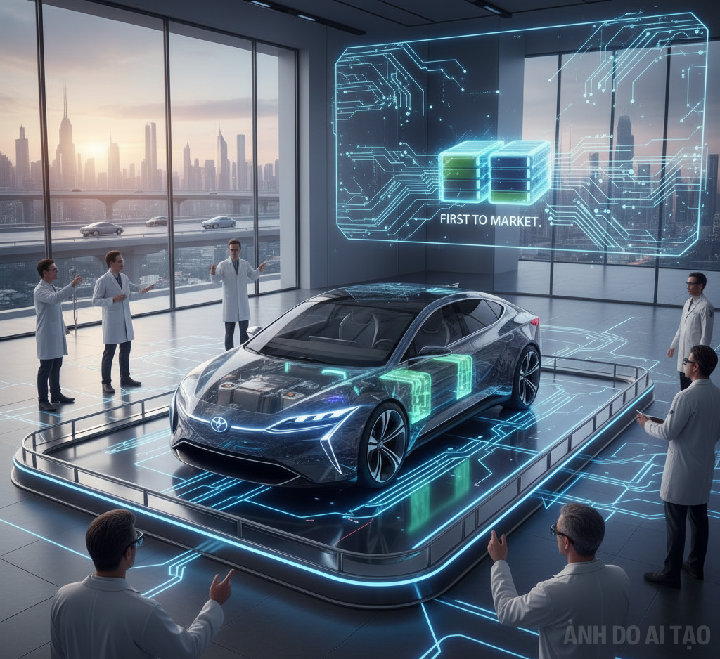 Toyota đặt mục tiêu cho ra mắt chiếc xe chạy hoàn toàn bằng pin thể rắn vào năm 2027-2028. Bước đi này không chỉ là bước tiến lớn cho riêng Toyota mà còn có thể thay đổi toàn bộ cục diện thị trường xe điện toàn cầu. Ảnh minh họa do AI tạo