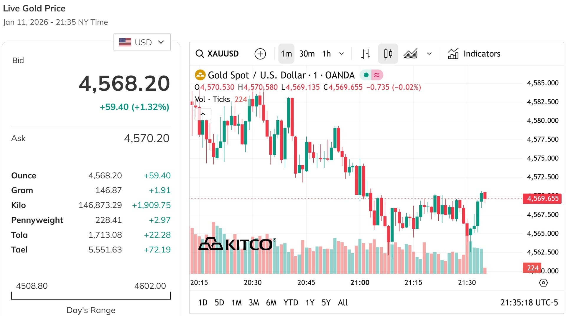 Trên thị trường quốc tế, giá vàng thế giới đã vượt mốc 4.568 USD/ounce, ghi nhận mức tăng 1,32%. Tính đến 09h30 ngày 12/01/2026 (giờ Việt Nam), giá vàng giao ngay đạt 4.568,2 USD/ounce, tăng 59,4 USD/ounce so với ngày hôm qua.
