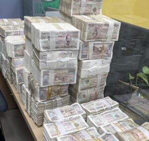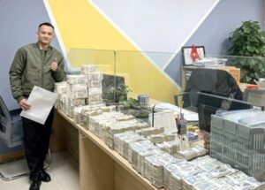 Anh Hoàng Hiệp – nhân viên bán ô tô – đứng cạnh các cọc tiền do khách hàng đưa đến (Ảnh: Nhân vật cung cấp).